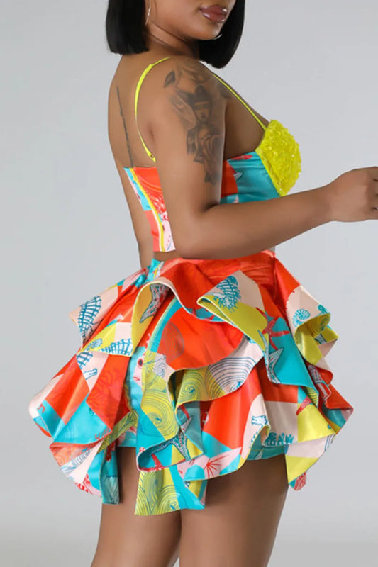 Colour Sexy Print Sequins Patchwork Flounce Spaghetti Strap Sleeveless Two Pieces (W21)